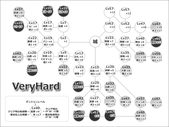(※ダンジョン詰め合わせ) Normal:レベル 34 Hard:レベル 51 Very Hard:レベル 85 初回クリアで防具屋建設可能数が増加する。